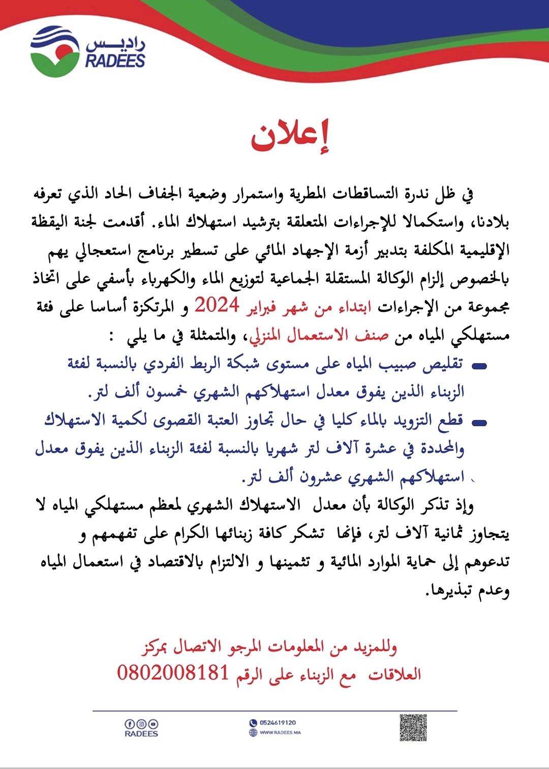 لاراديس آسفي تعلن عن خفض صبيب المياه والذي يصل للقطع للمبذري الماء الصالح للشرب