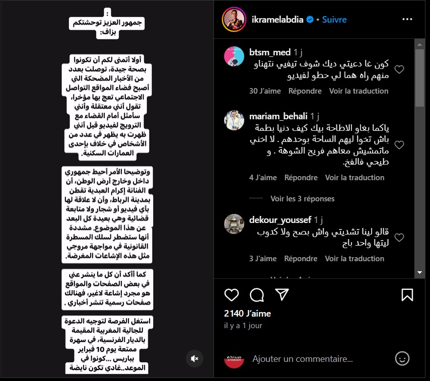 ونشرت إكرام العبدية، عبر حسابها الرسمي على موقع التواصل الاجتماعي “انستغرام“، تدوينة تكشف من خلالها حقيقة خبر اعتقالها قائلة: “جمهوري العزيز توحشتكم بزاف أولا أتمنى لكم أن تكونوا بصحة جيدة، توصلت بالعديد من الأخبار المضحكة التي أصبح فضاء مواقع التواصل الاجتماعي تعج بها مؤخرا، تقول أنني معتقلة وأنني سأمثل أمام القضاء مع الترويج لفيديو قيل أنني ظهرت به يظهر فيه عدد من الأشخاص في خلاف بإحدى العمارات السكنية”