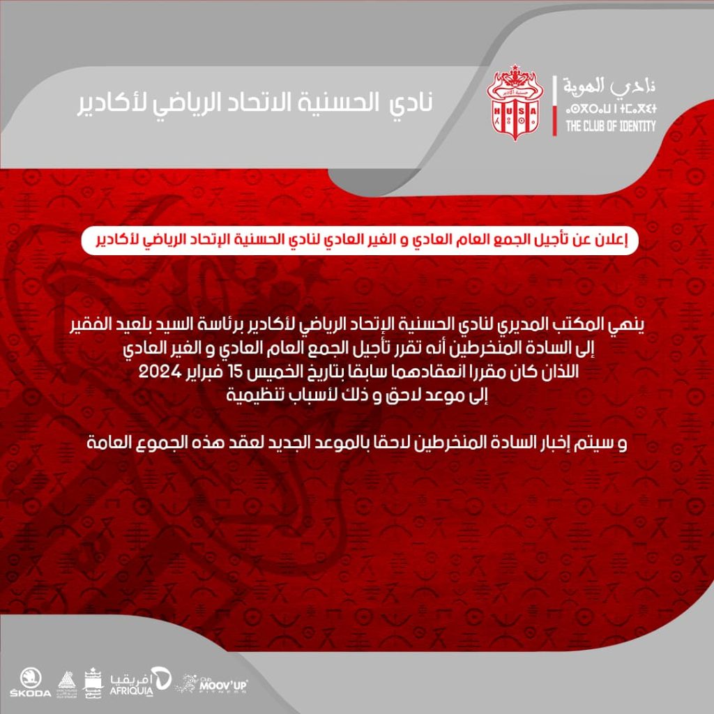 أعلن المكتب المديري لنادي الحسنية الإتحاد الرياضي لأكادير عن تأجيل أشغال الجمع العام العادي و غير العادي اللذان كان سينعقدان يوم غد الخميس إلى موعد لاحق.