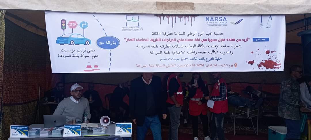 تحث شعار ” 1400 قتيل في فئة مستعملي الدراجات النارية لنضاعف الحذر” خلدت المصلحة الإقليمية للوكالة الوطنية للسلامة الطرقية وبشراكة مع المندوبية الإقليمية للصحة والحماية الإجتماعية بقلعة السراغنة وبمشاركة مدارس تعليم السياقة والهلال الأحمر المغربي صباح اليوم الأربعاء 14 فبراير 2024 اليوم الوطني للسلامة الطرقية 2024 بتنظيم حملة للتبرع بالدم بحلبة الإمتحان التطبيقي للسياقة والتي إستمرت طيلة اليوم محققة نجاحا متميزا خصوصا وأن عدد المتبرعين فاق التوقعات ملبين نداء المصلحة الإقليمية للسلامة الطرقية التي عنونت حملتها بعدد الأرواح التي تزهق لمستعملي الدراجات النارية.