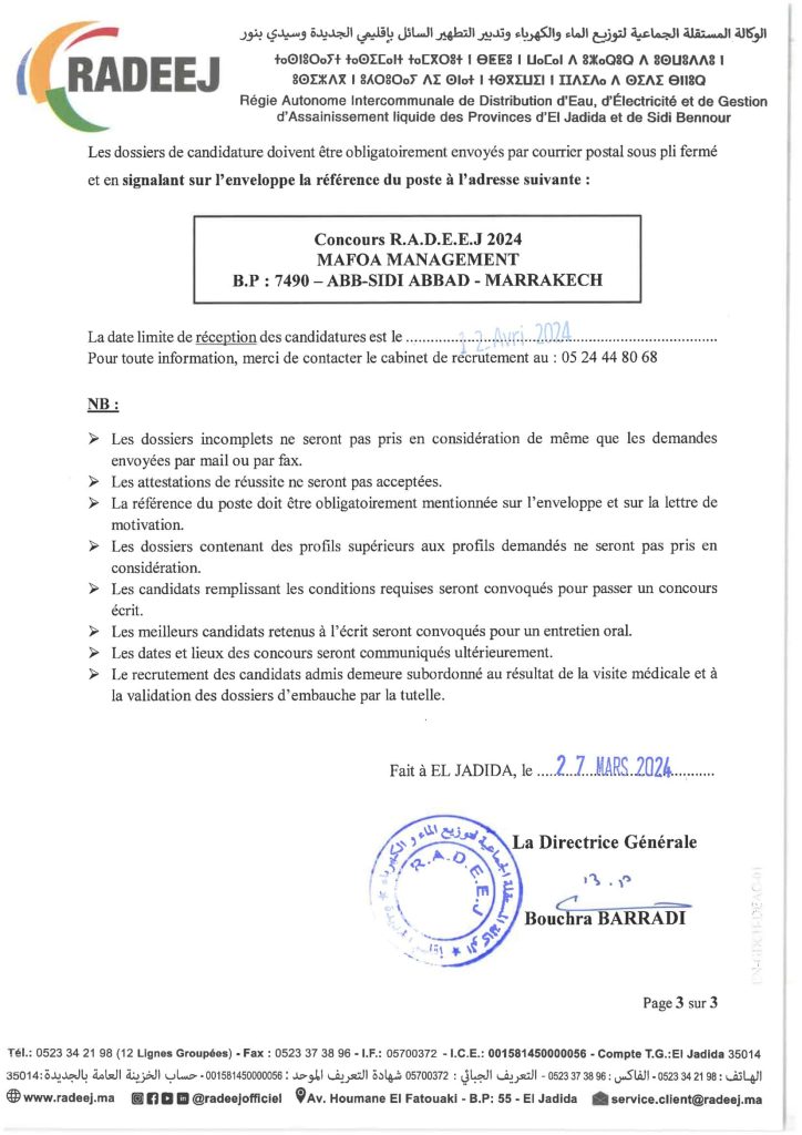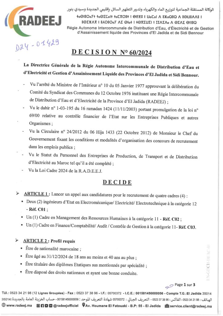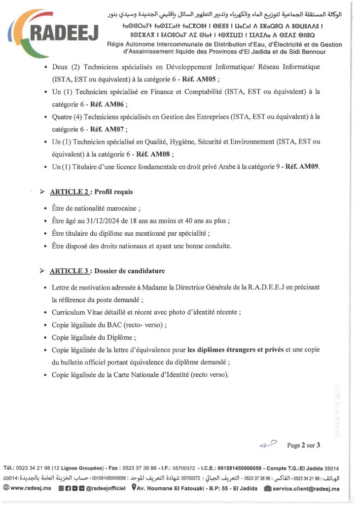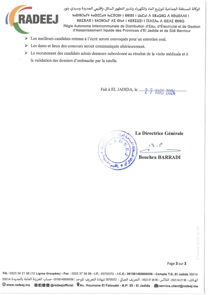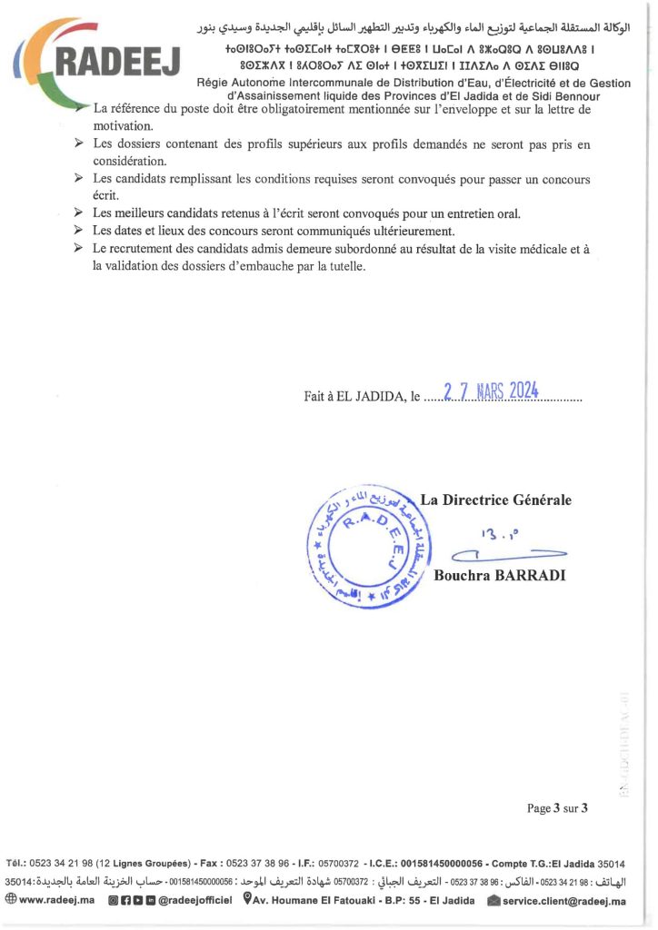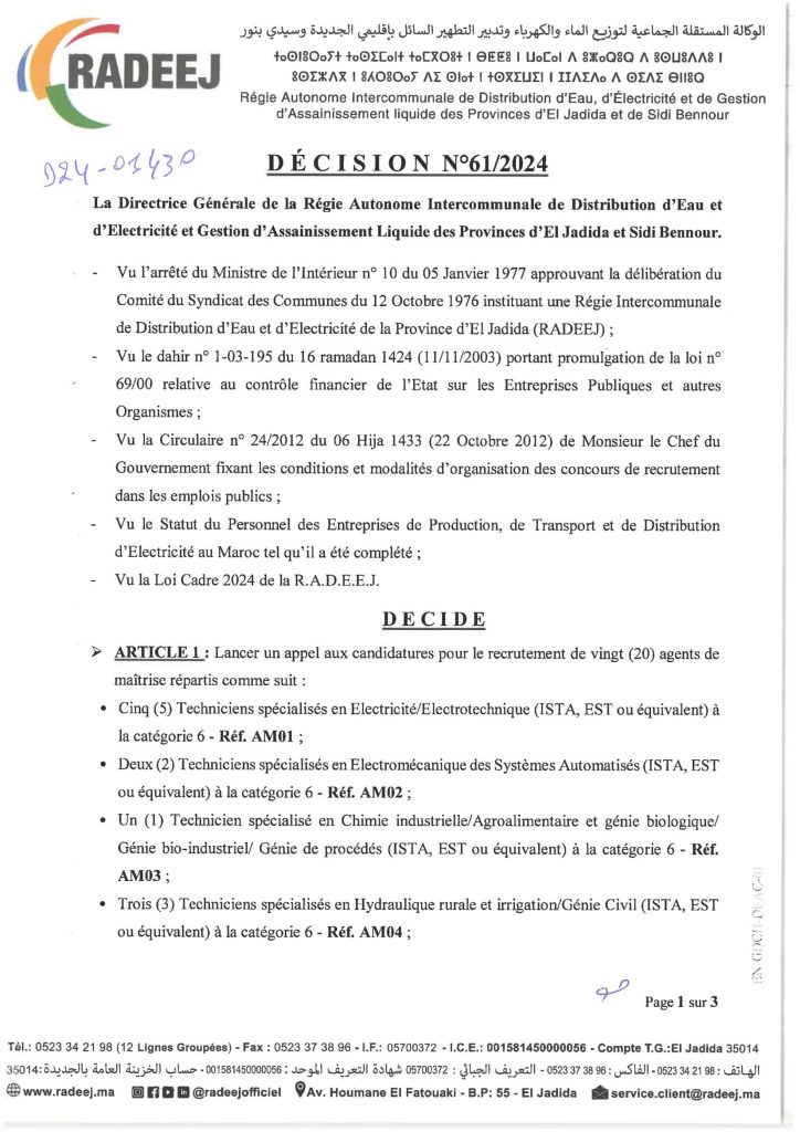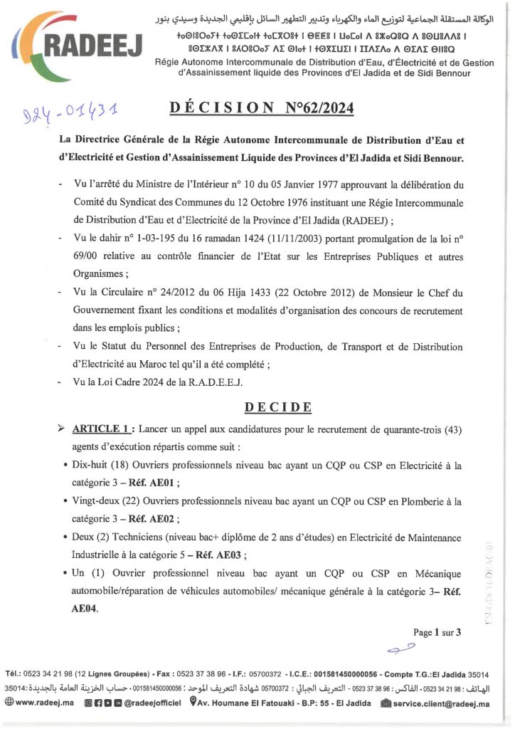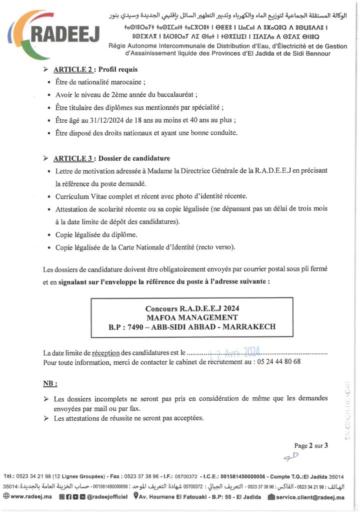 مباراة توظيف 67 منصب بالوكالة المستقلة الجماعية لتوزيع الماء والكهرباء بالجديدة 2024